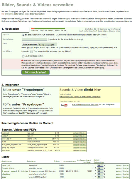 bis zu 50 MB WebSpace für Bildintegration in Fragen (Bilder, Videos, YouTube, PDF, swf, flv, etc.)