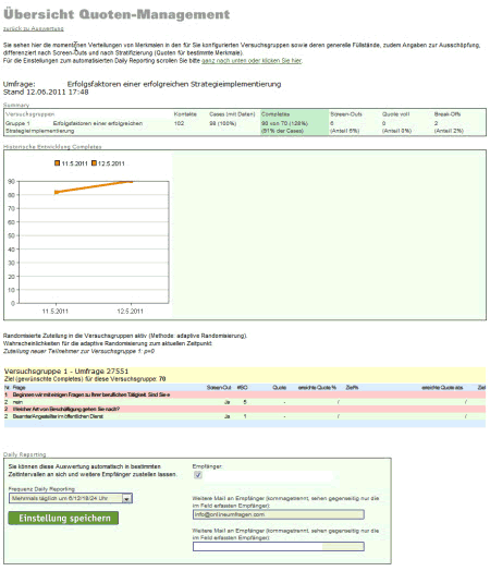 Daily Reporting (9 Uhr, 12 Uhr, 17 Uhr, 24 Uhr, nach Wahl) mit detaillierten Angaben zu Completes, Fällen, Quoten, Füllgrad, Screenouts, grafischer Übersicht und CC: und BCC: Möglichkeiten für Sie, Projektmitarbeitende oder Ihren Panel-Anbieter