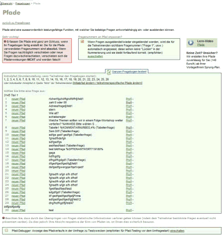 Mit Pfaden kann nicht nur ein Sprung oder ein Filter sondern ein ganzer weiterer Fragebogenverlauf komlett antwortbasiert oder bedingungsbasiert beeinflusst werden (z.B. Fragen 10-15 ausblenden wenn Antwort bei Frage 2 "sehr gut" oder "gut" usw.)
