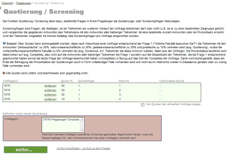 Setzen Sie Quoten auf Ihre Fragen und Antwortvorgaben (z.B. männlich 50, weiblich 50). Überzählige Teilnehmer gelangen dann auf Ihre Quotafull-Seite (frei definierbar)