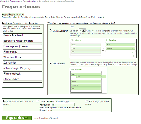 Wählen/Sortieren (Auswahl von n Antworten und Sortierung per Drag & Drop) oder nur Sortieren (ändern der Reihenfolge per Drag & Drop)