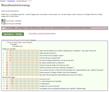 Zusätzliche Randomisierung (6 aus 45) möglich, z.B.. "zeige in Frage B nur die Antwortvorgaben, die in Frage A mit "eher ja" oder "ja" bewertet wurden und, wenn mehr als 5 so bewertet wurden, nur 5 davon zufällig ausgewählt, und zusätzlich die Marke "XY" immer."